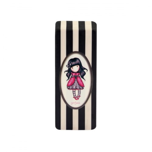 - Na gumce znajduje się wizerunek Dziewczynki Gorjuss otoczony złotą ramką. Cała gumka pokryta jest biało-czarnymi paskami.