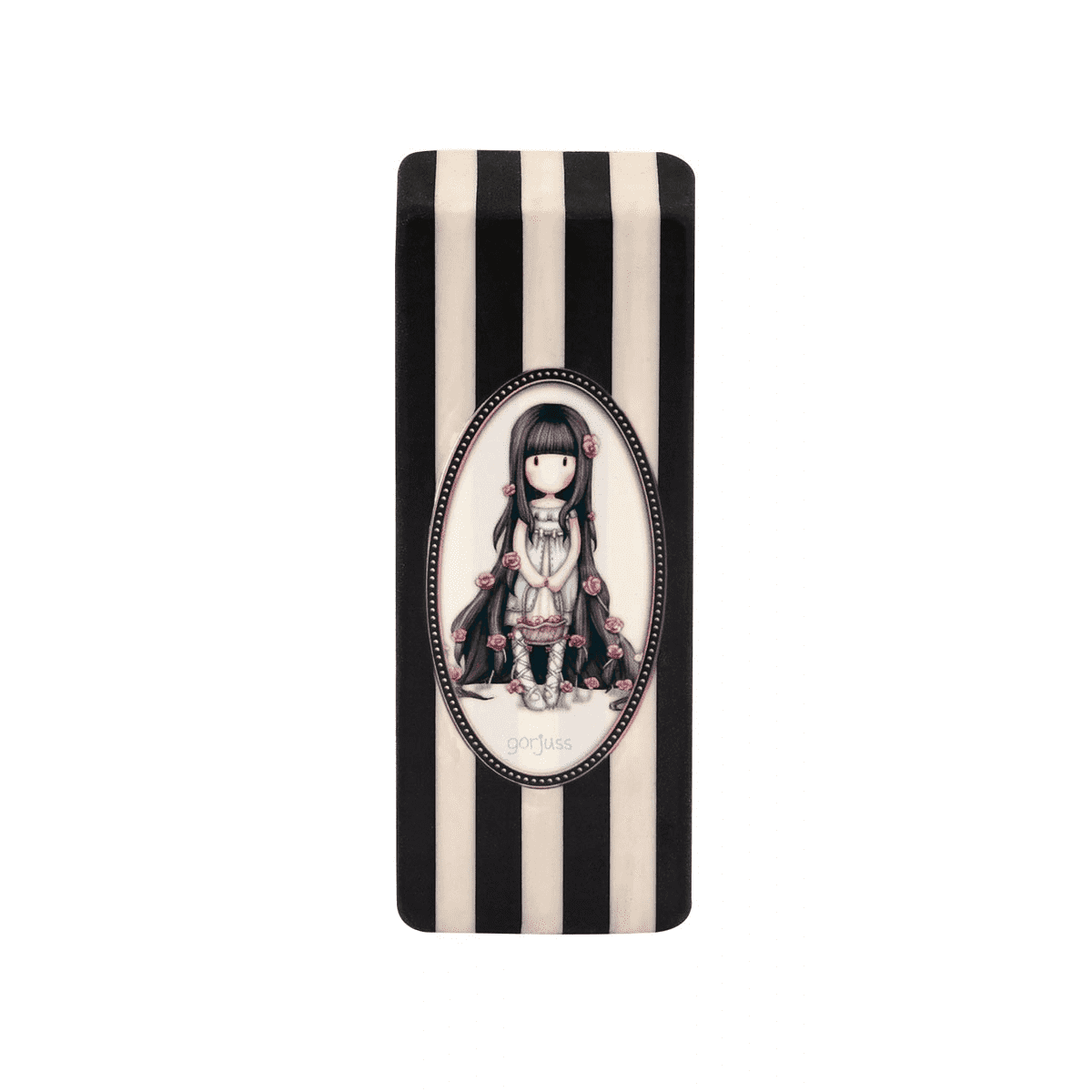 - Na gumce znajduje się wizerunek Dziewczynki Gorjuss otoczony złotą ramką. Cała gumka pokryta jest biało-czarnymi paskami.