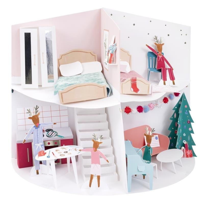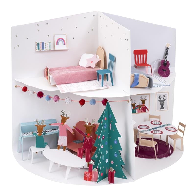 Kalendarz adwentowy w postaci ozdobnego pudełka z 24 okienkami. 24 Okienka zawierają elementy wystroju domku oraz postacie, którymi zaaranżujemy cały domek w świątecznym klimacie.