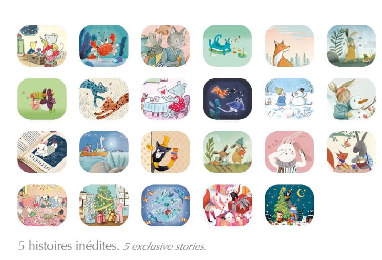 - 23 dyski z bajkami (18 bajek z różnych kolekcji Moulin Roty oraz 5 krążków ze specjalnymi, świątecznymi historyjkami)