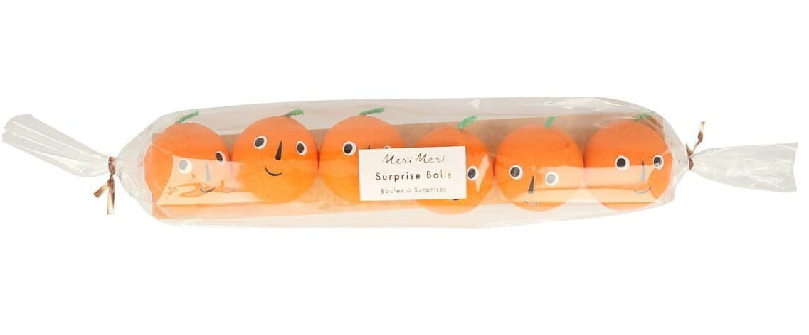 Każda kula zawiera kapelusz imprezowy, 2 naklejki, żart i pomarańczową, bransoletkę przyjaźni