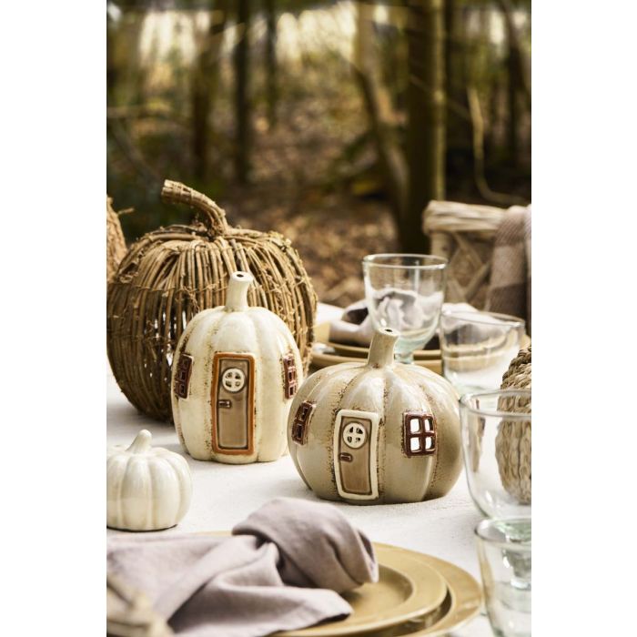 Urocza latarenka ceramiczna w kształcie dyni. Latarenka wykonana jest z ceramiki w kolorze kremowo-rdzawym i przeznaczona na świeczki typu tealight.