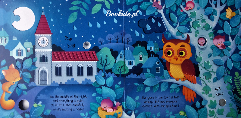 “Night Sounds” to niezwykła książka dźwiękowa. Specjalnie powycinane i wyżłobione strony oraz przyciski dźwiękowe zapraszają w sensoryczną podróż nocą. Wsłuchaj się w magiczne mruczenie śpiących kotów, zegar wybijający północ, huczenie sowy, padający deszcz oraz nastanie świtu z jego radosnymi dźwiękami.