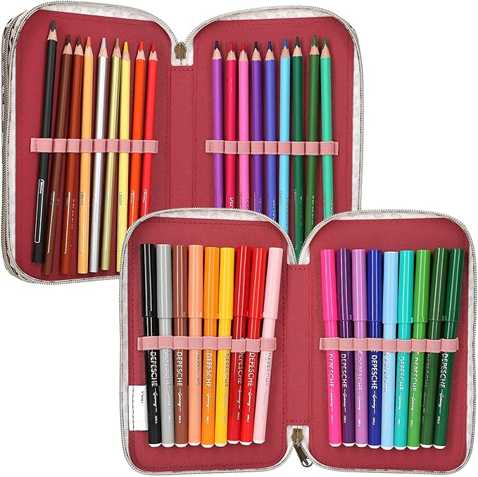 Wypełniony 18 kolorowymi pisakami, 2 ołówkami, gumką, temperówką, linijką, nożyczkami i klejem w sztyfcie
