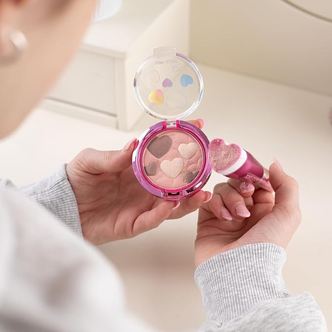 Połyskujący, opalizujący bronzer, który zawiera w zestawie lusterko i gąbeczkę w kształcie serduszka.