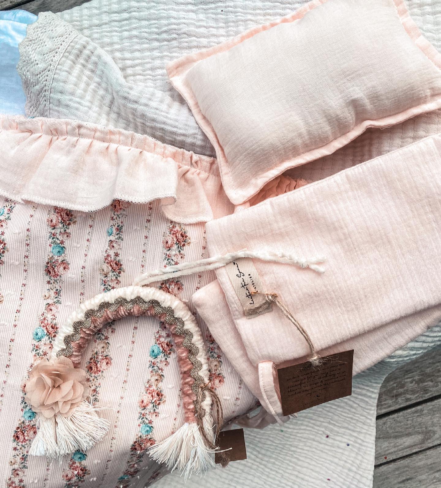 Zestaw pościeli dla lali od Valentina The Swan w skład w którego wchodzi podusia, kołderka oraz ochraniacz na łóżeczko/do koszyka.