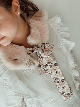 Dziewczęcy kołnierzyk wykonany z puchatego materiału, który będzie idealnym wykończeniem stroju: bluzki czy sukienki. Posiada wstążkę w delikatne kwiatuszki. Piękne detale wykończeniowe sprawiają, że prezentuje się bardzo efektownie. Wykonany w jednym z hiszpańskich atelier, gdzie ręcznie szyje się produkty Valentina The Swan.