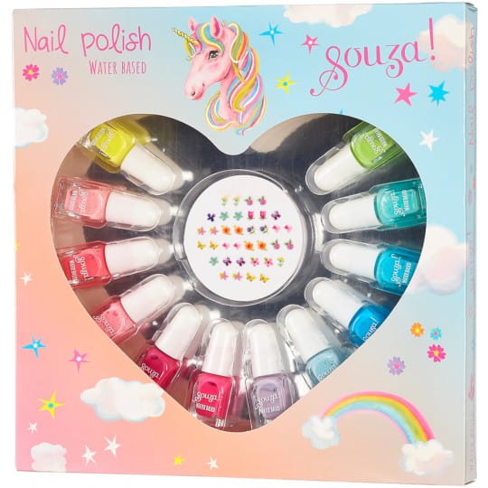 Duży zestaw do manicure dla dzieci holenderskiej marki Souza! zawiera lakiery na bazie wody w 12 pięknych kolorach oraz ozdobne naklejki na paznokcie.