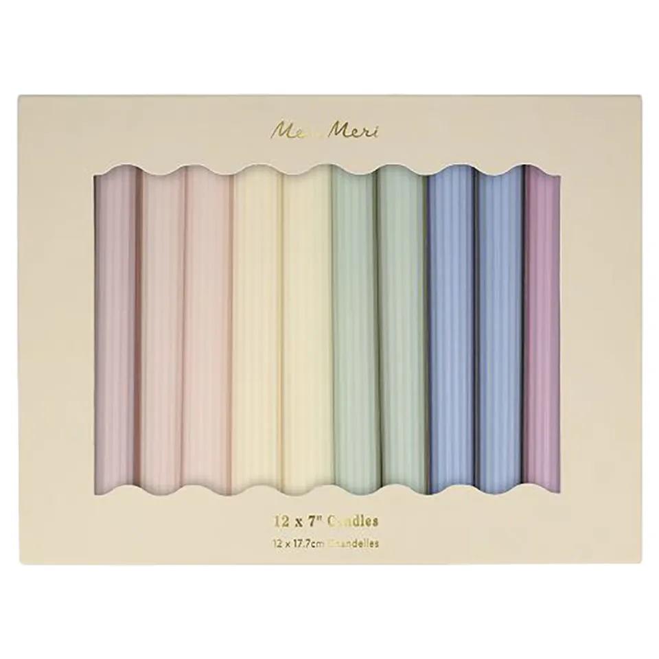 Zestaw 12 pastelowych świec w 6 kolorach od Meri Meri o standardowej, uniwersalnej średnicy. Pasują do większości świeczników o uniwersalnym gwincie.