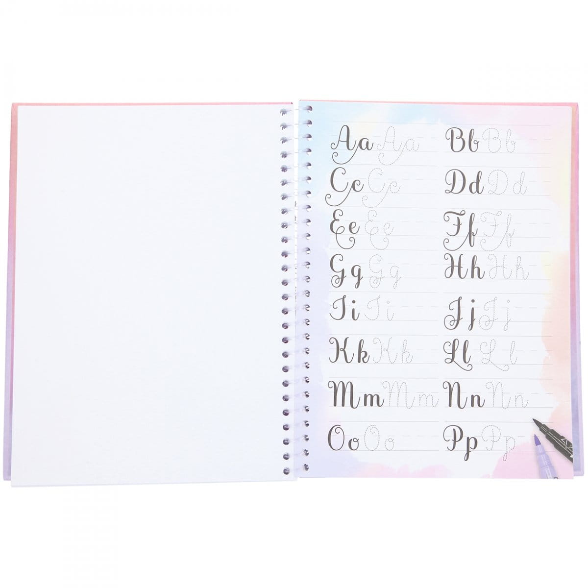 Zestaw do kaligrafii z niezbędnymi akcesoriami piśmienniczymi w transparentnej saszetce. Na pastelowych stronach książki znajdują się propozycje do nauki i naśladowania ciekawych fontów piśmienniczych, obrazków do ozdabiania listów i kartek oraz kolorowe strony służące jako papeteria.