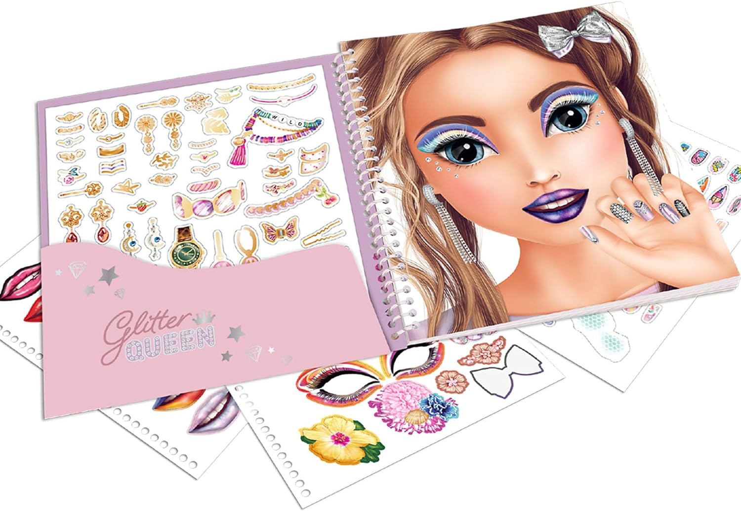 Kreatywna ksiazka zawierajaca 7 arkuszy naklejek z duza iloscia bizuterii i naklejek do makijazu oraz strony, gdzie można naszkicować własne makijaże.