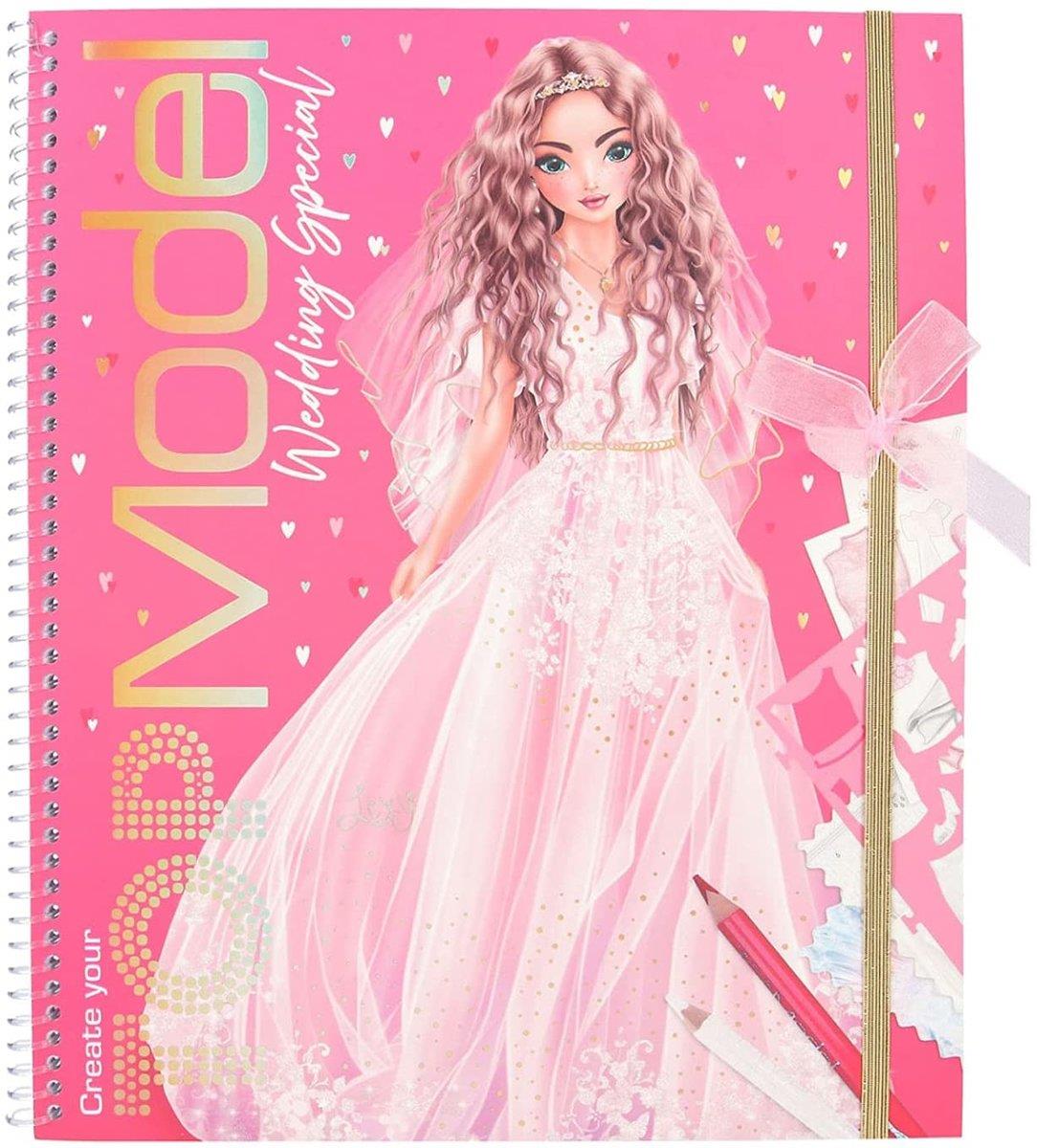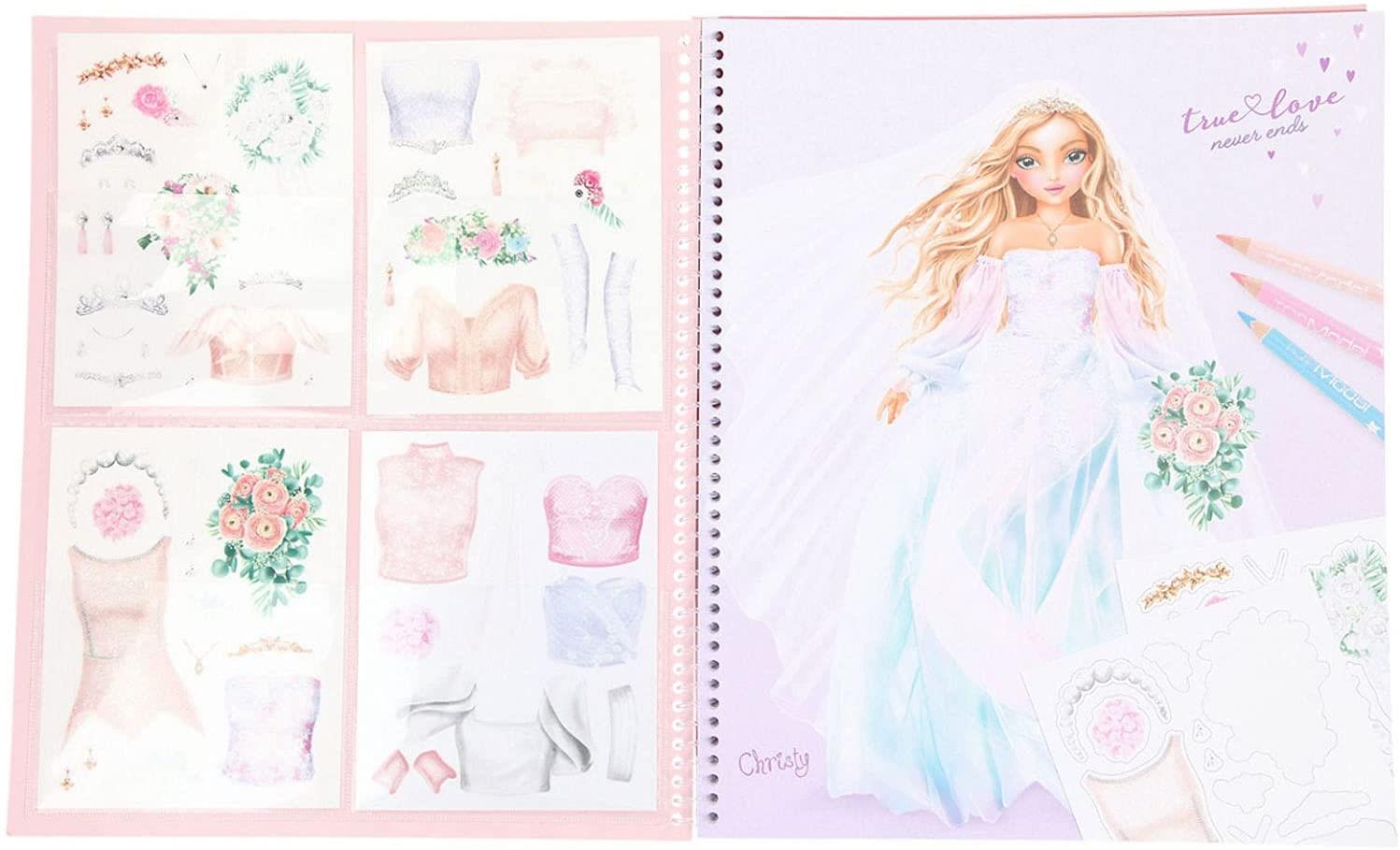 Zestaw kreatywny do szkicowania i kolorowania z szablonami, naklejkami oraz wzorami tkanin do wycięcia. Celem jest zaprojektowanie sukien ślubnych oraz dodatków. W książeczce znajdują się również gotowe propozycje krok po kroku jak stworzyć piękne szkice i je ozdobić gotowymi elementami.