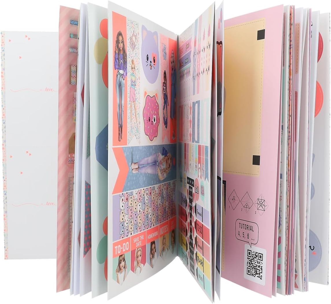 Zestaw kreatywny zawiera 32 kolorowe strony z papierowymi szablonami, 8 arkuszy naklejek do dekoracji i 9 kartonowych arkuszy do malowania, tworzenia i projektowania.