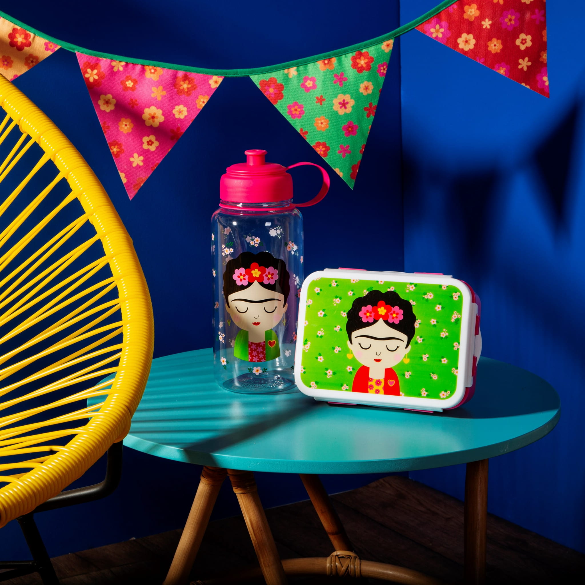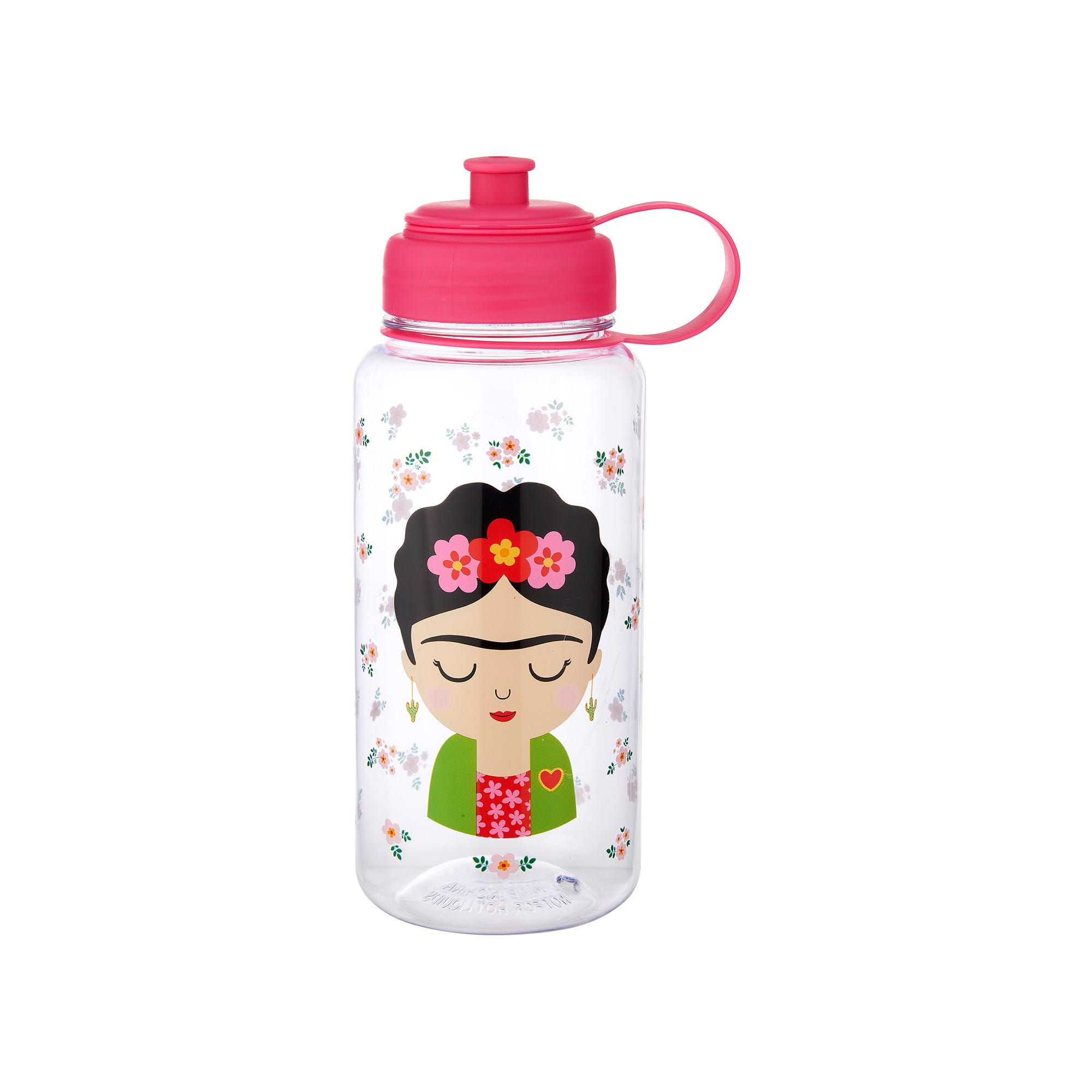 Śliczna, transparentna butelka o wysokości 25 cm i pojemności 1000 ml z wizerunkiem Fridy.