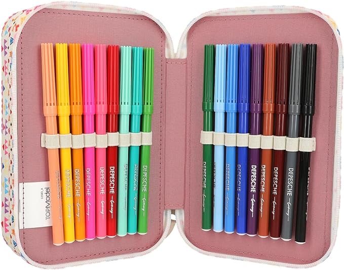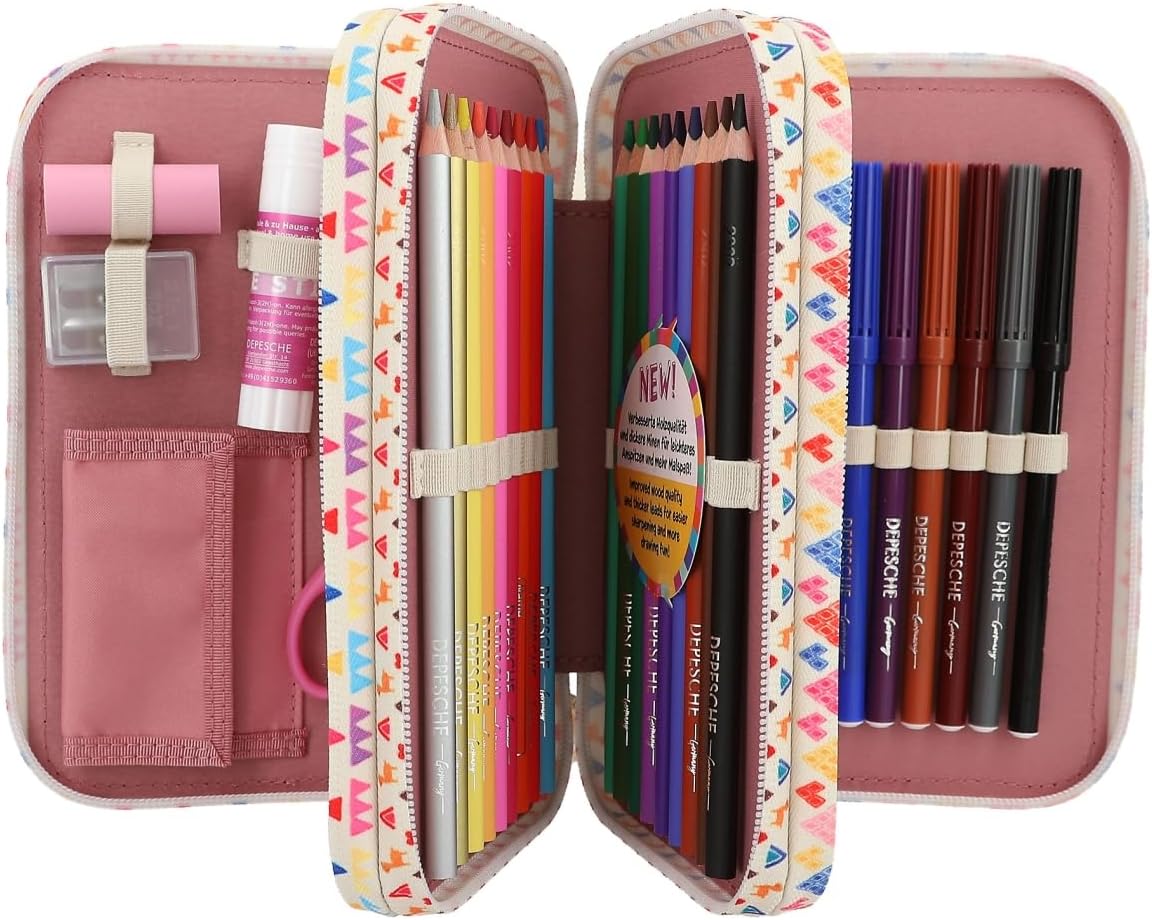 Wypełniony 18 kolorowymi pisakami, 2 ołówkami, gumką, temperówką, linijką, nożyczkami i klejem w sztyfcie