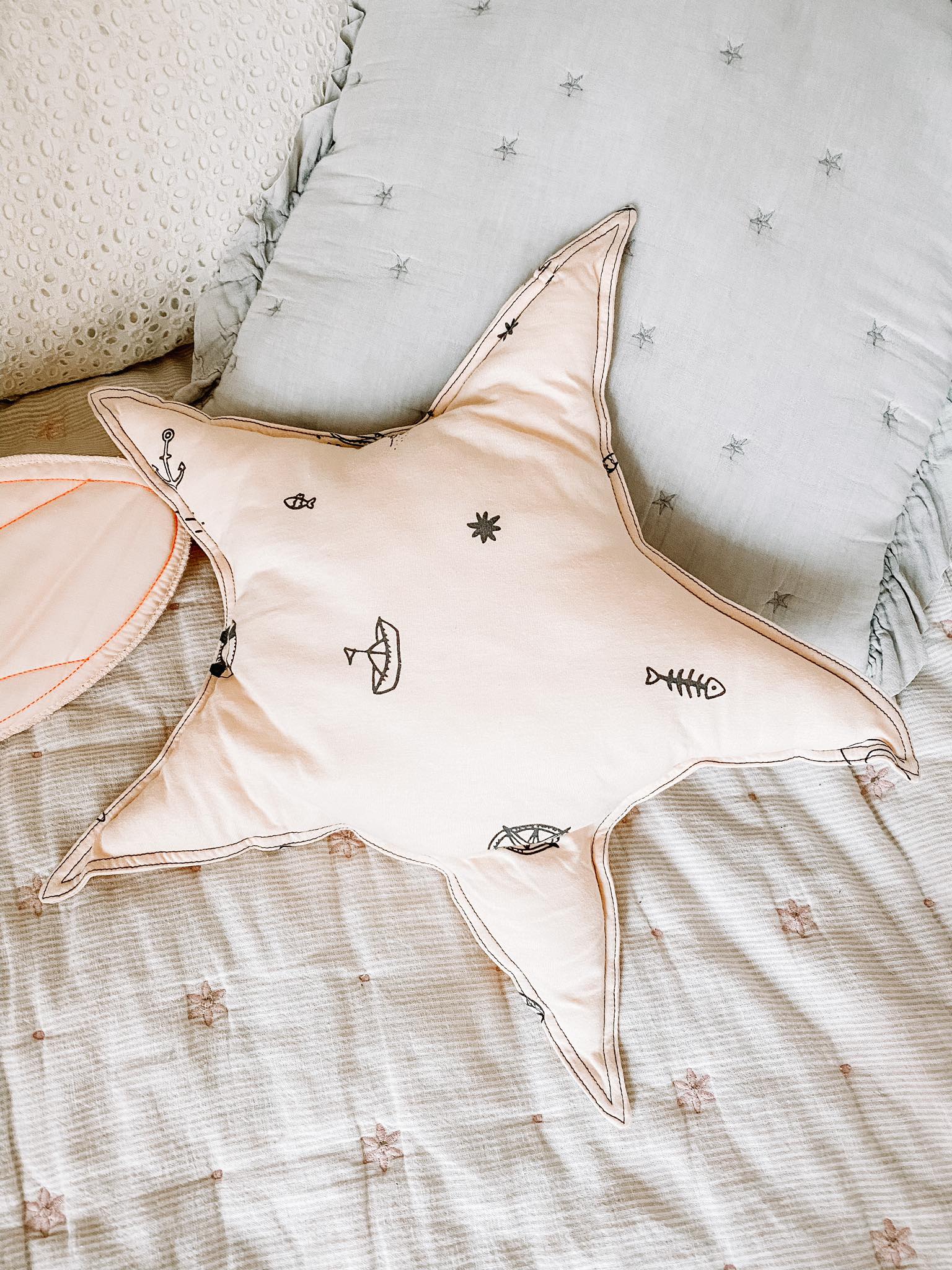 Poduszka ozdobna w kształcie gwiazdki w kolorze pudrowym (wzór "Stars in the galaxy") jest świetnym dopełnieniem zestawu pościelowego od Ndoto.