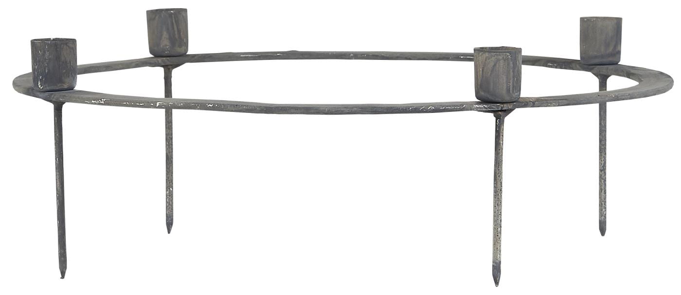 Metalowy świecznik z miejscem na 4 świece, który służy jako obręcz, którą należy wbić w dekorację kwiatową lub wieniec.